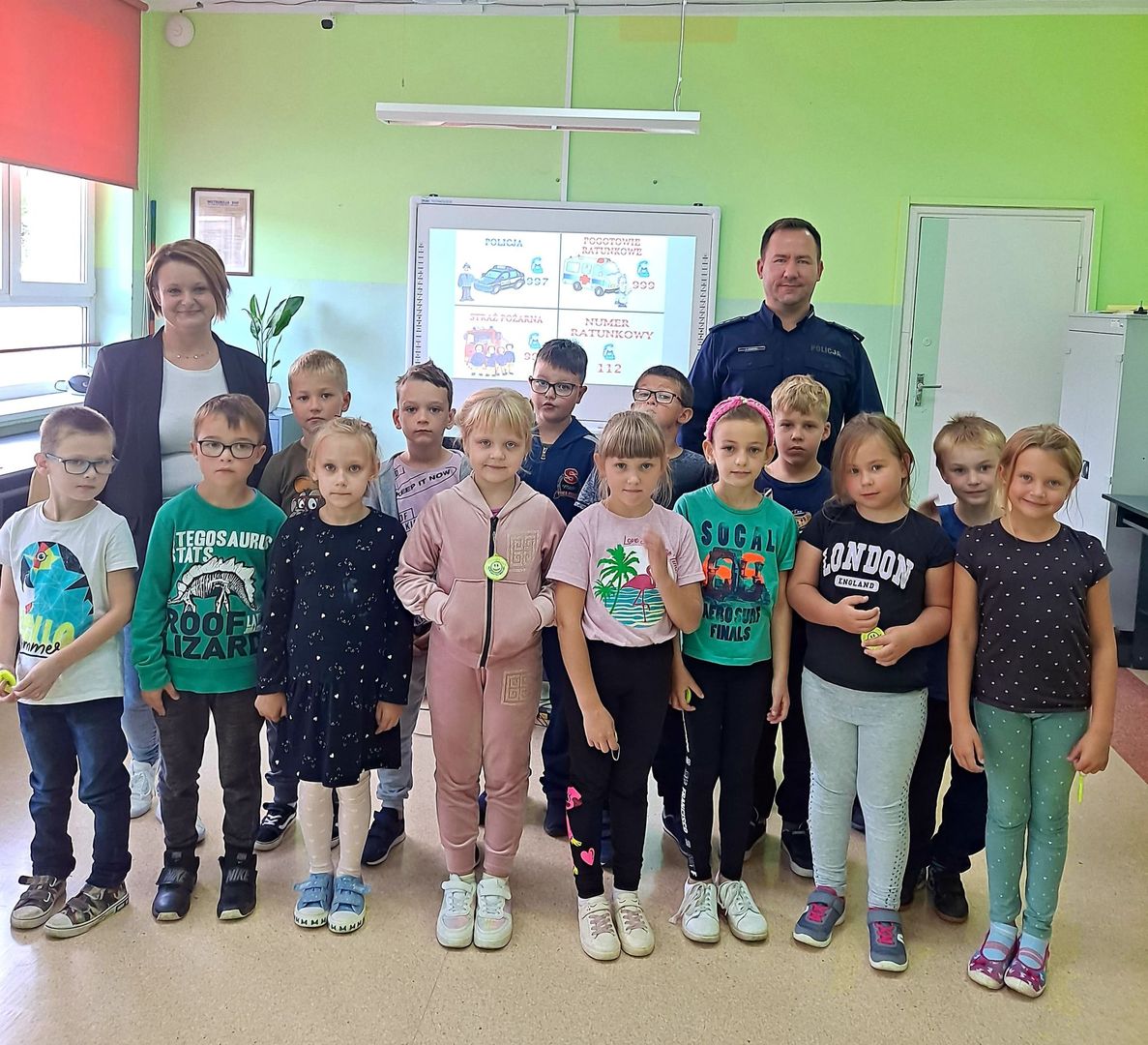 Dnia 12 września 2022 r. uczniowie klas pierwszych wzięli udział w zajęciach profilaktycznych na temat poprawy bezpieczeństwa w szkole  i poza nią. Zajęcia przeprowadzili p. Paulina Stawirej oraz dzielnicowy, p. Tomasz Pokorski z Komendy Policji    w Nowogardzie, którzy przypomnieli uczniom podstawowe zasady bezpiecznego poruszania się po drogach oraz numery alarmowe służb ratunkowych. Dzieci dowiedziały się jak zachować się w różnych sytuacjach np. w kontakcie z obcym psem lub z nieznajomym człowiekiem. Uczniom przekazano nie tylko teorię, ale także pokazano w praktyce jak bezpiecznie korzystać z przejścia dla pieszych. Dzieci otrzymały również  elementy odblaskowe poprawiające znacząco ich widoczność  a tym samym zwiększające bezpieczeństwo.