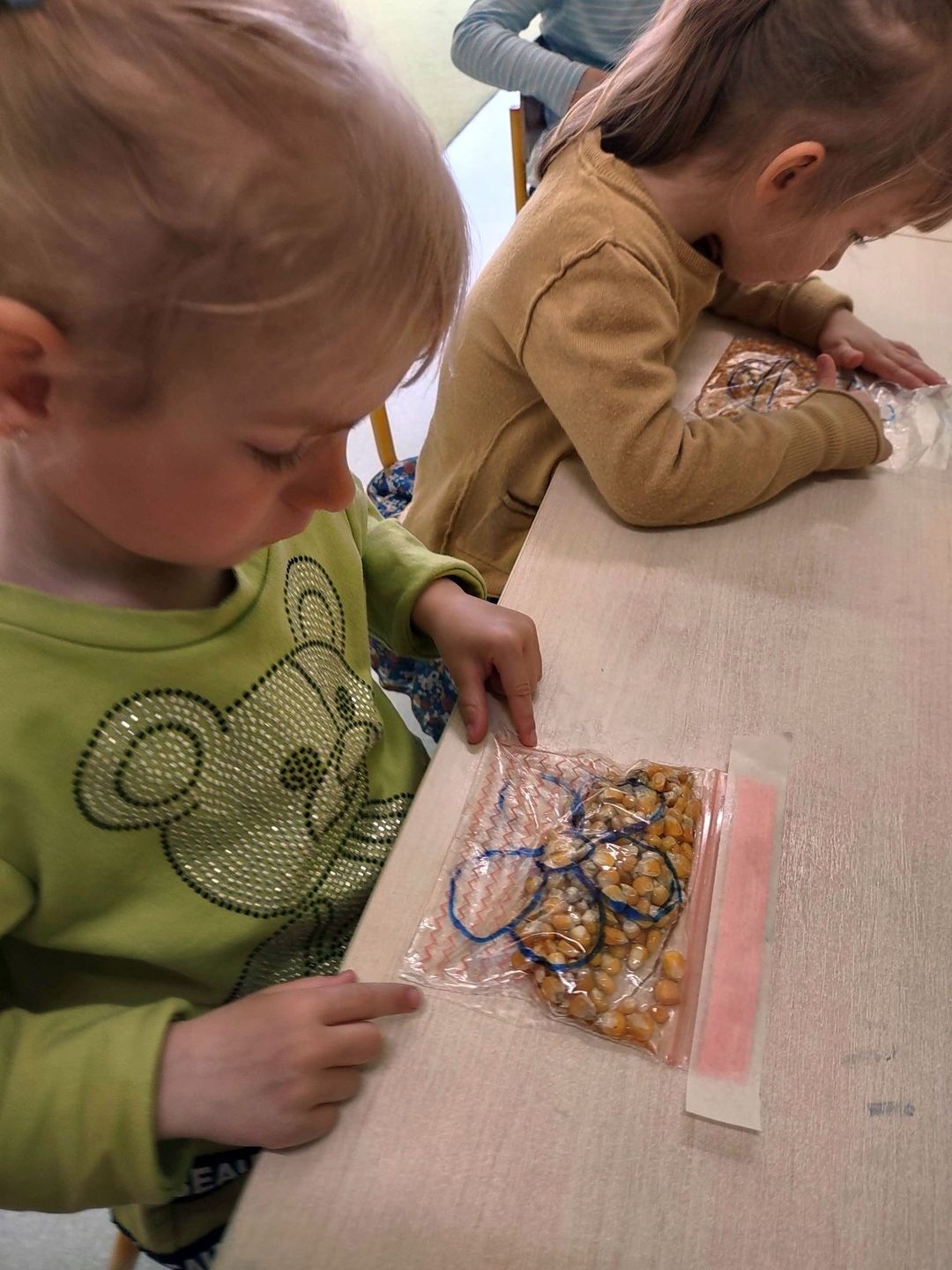 Na worku strunowym za pomocą markera narysowaliśmy na środku kontur pisklaka, kwiatka. Następnie każde z dzieci wsypało do kubeczka około 5 łyżek kukurydzy i dodało do tego trochę oliwki. Następnie zawartość kubka wsypało do woreczka strunowego. Tak przygotowany worek leżał na stole i zadaniem dziecka było ruchami palców „doprowadzić” ziarenka kukurydzy tak, aby zapełniły cały kontur obrazka.