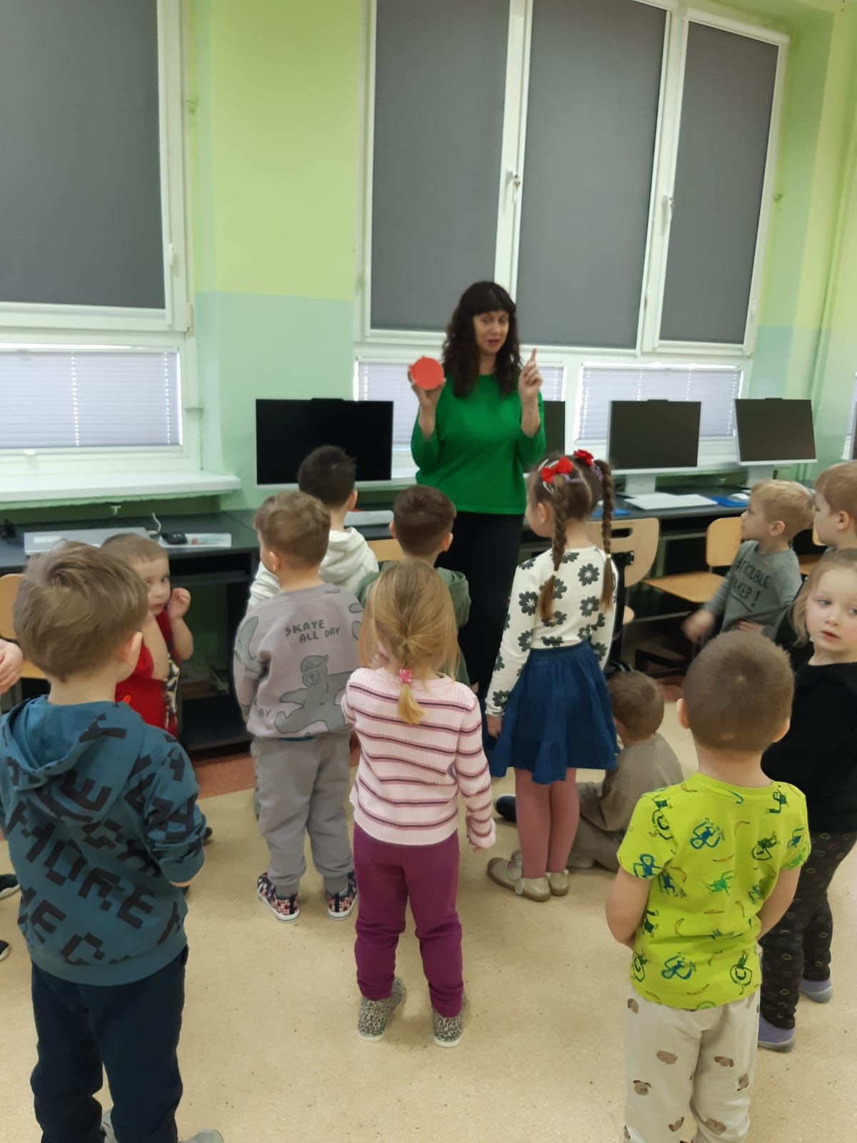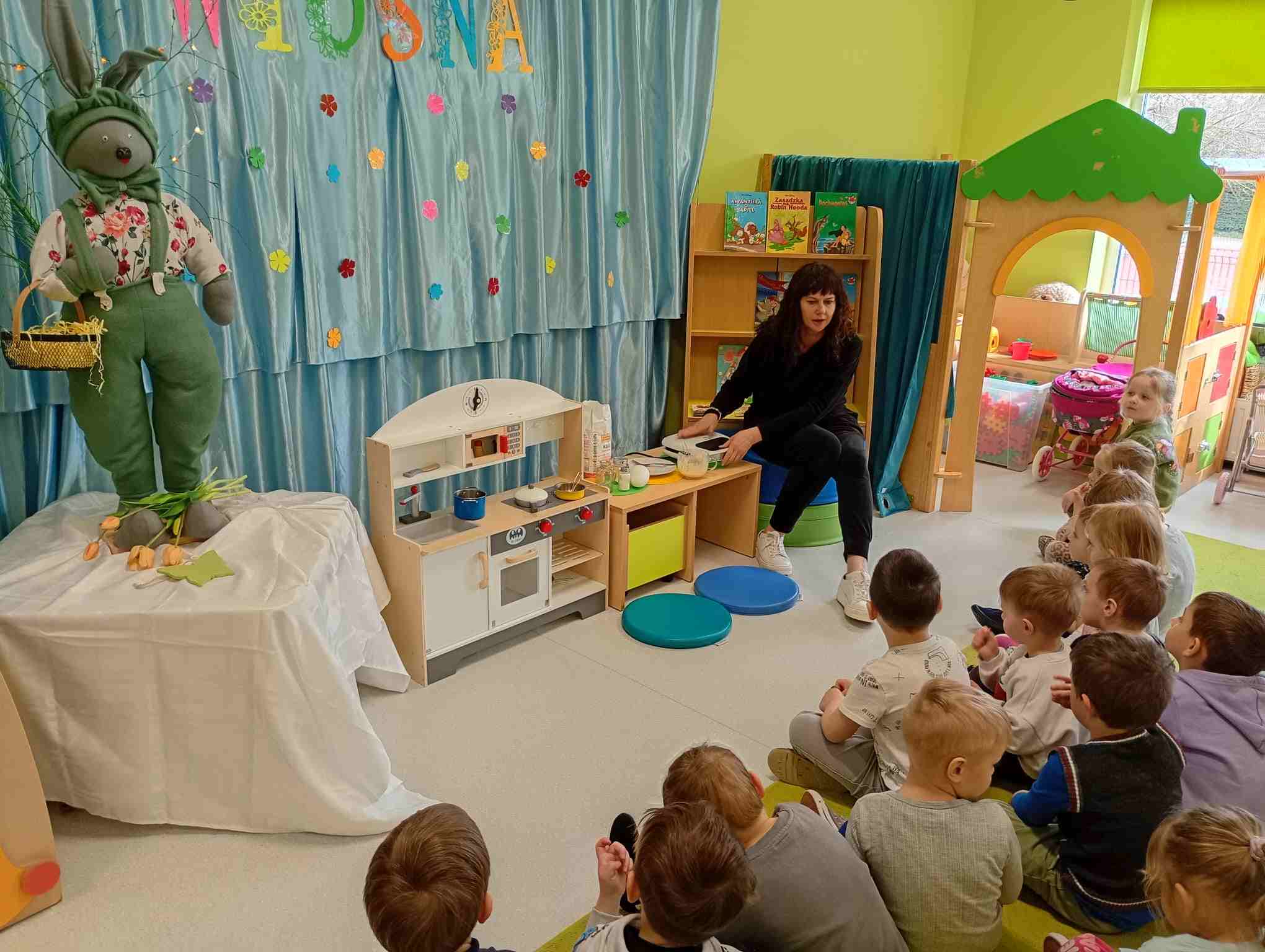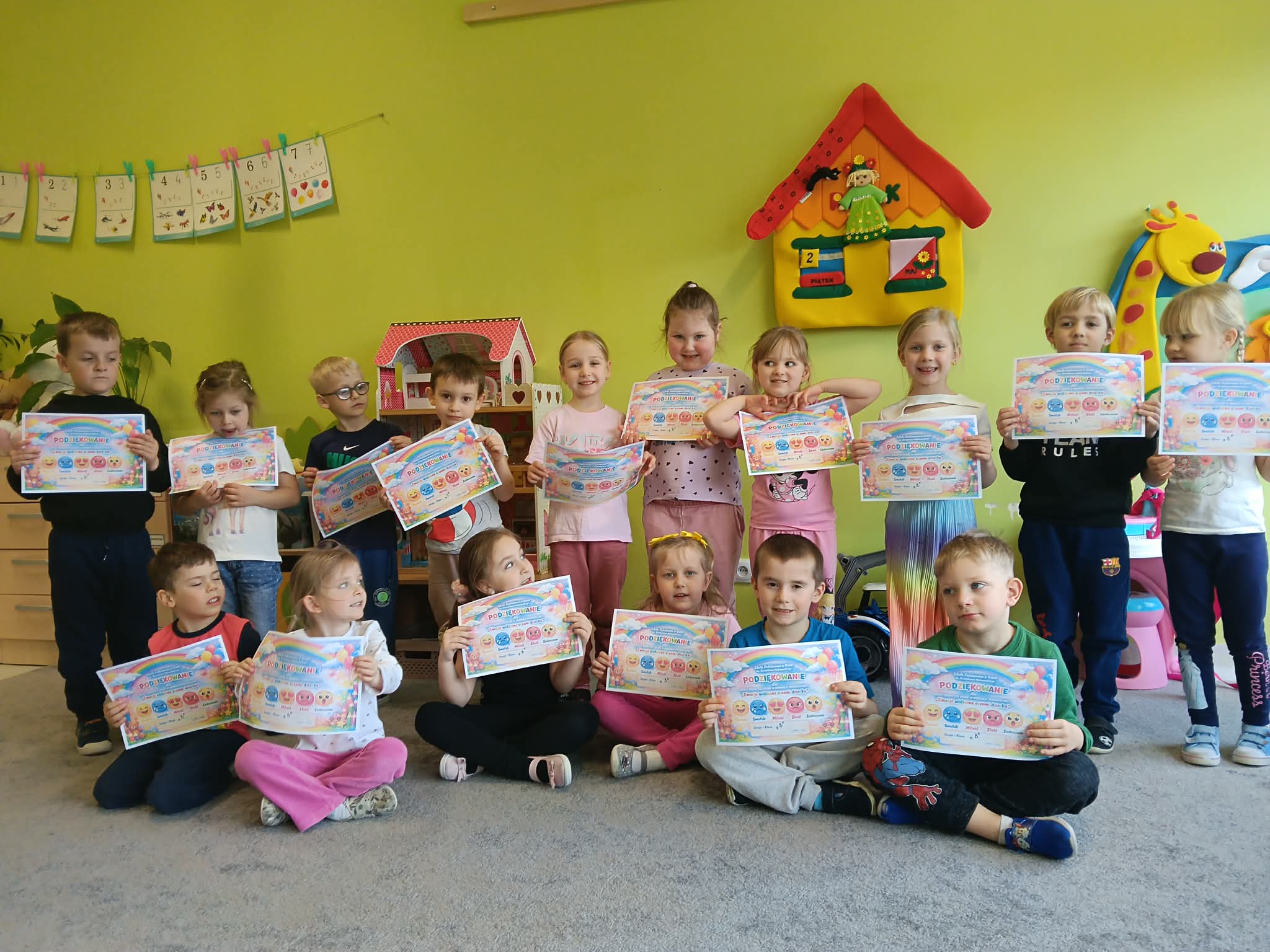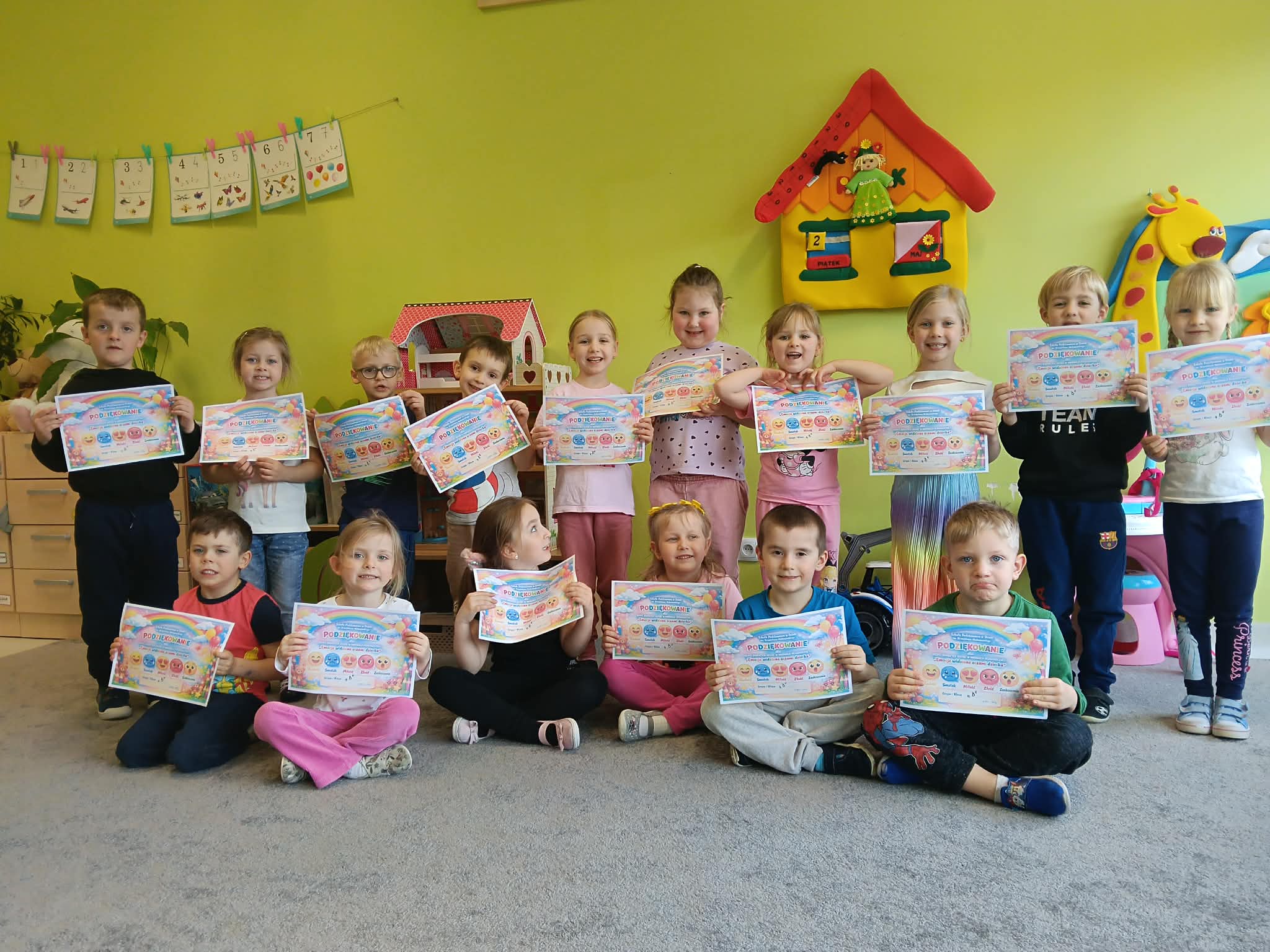W grupie B zakończyliśmy innowacja pedagogiczna „Emocje widziane oczami dziecka” miała na celu wspieranie rozwoju emocjonalnego i społecznego dzieci oraz pomoc w rozpoznawaniu i nazywaniu uczuć. Najważniejsze było stworzenie atmosfery, w której dzieci mogły swobodnie mówić o swoich emocjach, uczyć się empatii oraz rozwijać umiejętności współpracy i komunikacji z innymi. Podczas realizacji innowacji wykorzystywano różnorodne aktywności, takie jak rozmowy o emocjach, zabawy dramowe, prace plastyczne, elementy bajkoterapii, gry i zabawy integracyjne oraz pracę z kartami emocji. Dzieci chętnie brały udział w działaniach ruchowych, muzycznych i twórczych, które pomagały im wyrażać to, co czują. Ważnym elementem było także omawianie codziennych sytuacji oraz wspólne szukanie sposobów radzenia sobie ze złością, smutkiem czy strachem. W trakcie trwania innowacji można było zauważyć, że dzieci coraz lepiej rozpoznawały swoje emocje i potrafiły o nich opowiadać. Chętniej współpracowały ze sobą, okazywały więcej zrozumienia dla innych oraz częściej rozwiązywały konflikty poprzez rozmowę. Wzrosła również ich otwartość, pewność siebie i umiejętność proszenia o pomoc. Realizacja innowacji pokazała, że regularne rozmowy o emocjach oraz różnorodne działania praktyczne pozytywnie wpływają na funkcjonowanie dzieci w grupie.