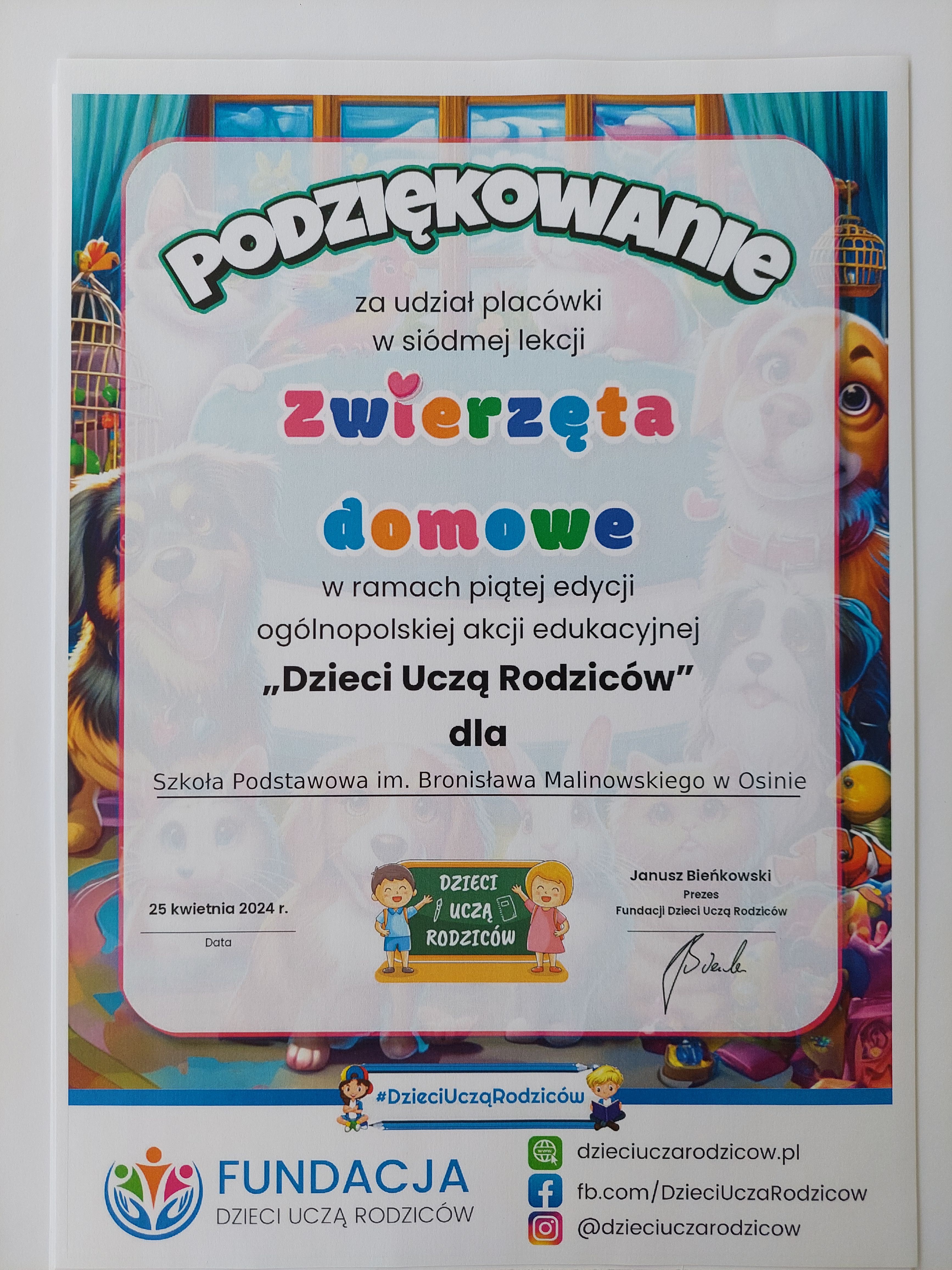 Podziękowanie dla szkoły