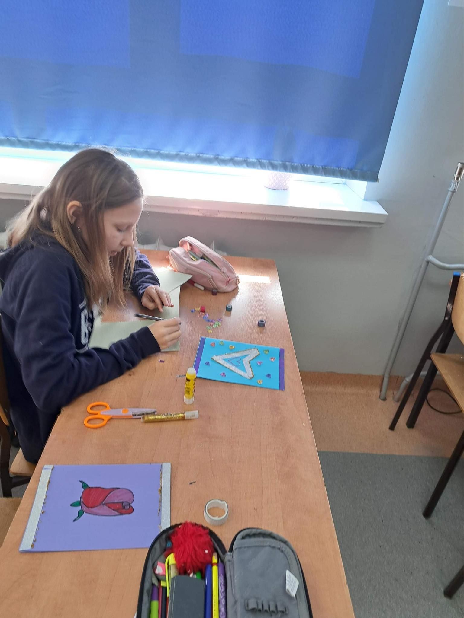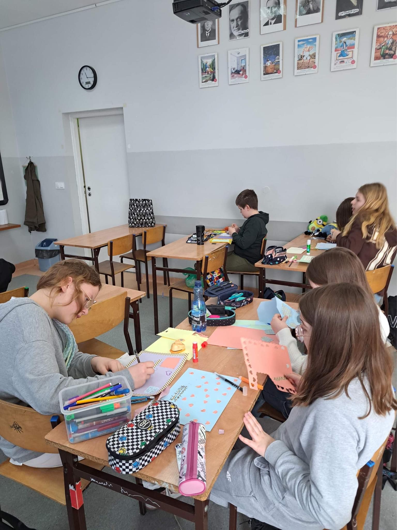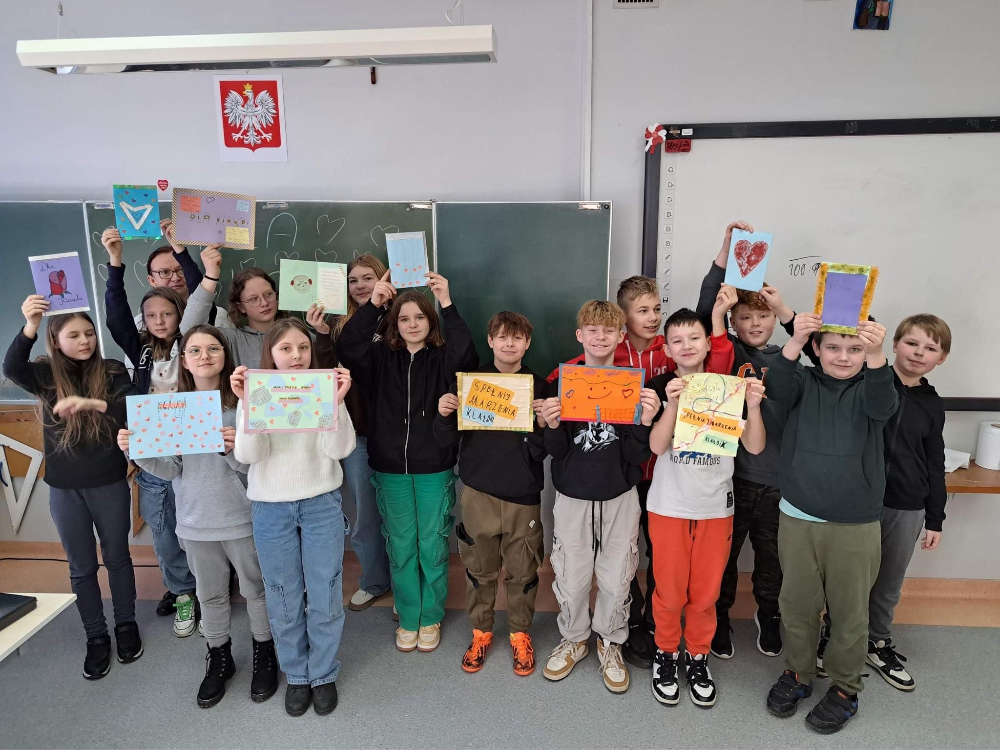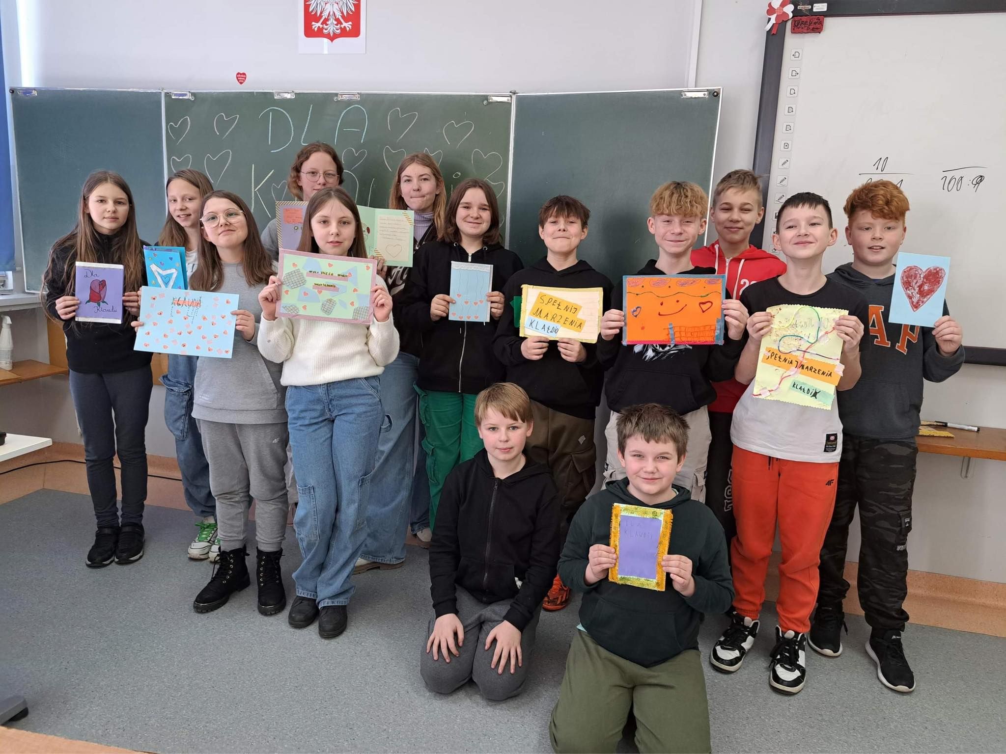 Uczniowie klasy 5a uczestniczyli w zajęciach warsztatowych. Obejrzeli filmik, na którym mogli zobaczyć, jak wygląda codzienność u osób z Zespołem Downa, oraz prezentację dzięki której poznali Klaudię i jej życie. Uczniowie byli bardzo zaangażowani i sami podsunęli mi pomysł o zrobieniu kartek dla Klaudii. Cała klasa pracowała bardzo twórczo i aktywnie wykonując swoje prace, które zostały spakowane i w najbliższym czasie zostaną przekazane adresatowi.