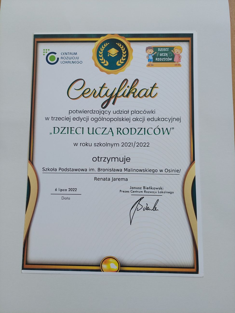 Nasza Szkoła uzyskała Certyfikat za zrealizowanie zadań w ramach trzeciej edycji ogólnopolskiej akcji edukacyjnej „ Dzieci uczą rodziców” w roku szkolnym 2021/2022. Certyfikat został przyznany przez Centrum Rozwoju Lokalnego. Akcja objęta jest honorowym patronatem Ministra Edukacji Narodowej.
